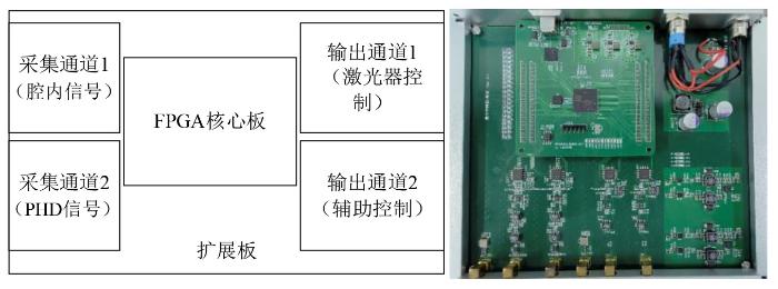 Kerr光孤子频率梳主动控制系统实物图如图3所示,硬件电路采用核心板+扩展板的模式进行设计.核心板主要布置了一块FPGA以及FPGA正常工作所需的电源系统、程序存储器以及与上位机通信的USB 2.0高速通信电路,FPGA的IO接口以及+3.3 V接口电源则通过3组接插件引出.扩展板则布置有两路采用18位中速ADC构成的信号采集电路以及两路18位DAC构成的输出电路.其中一路采集通道用于采集微腔的腔内功率信号以实现对Kerr光孤子台阶电平信号检测,另一路采集通道采集PDH误差信号用于实现失谐量的检测和锁定[16];而输出通道则主要用于输出电压信号反馈环路执行器件,例如控制激光器频率或功率以及用于其他器件的辅助输出控制.所有转换器的数据接口均为并行LVCMOS总线,并通过接插件直接连接至FPGA的IO接口,信号采集电路与模拟输出电路均采用具有低温度系数的带隙基准源作为转换器的参考电压,同时采用电流缓冲输出电路来避免转换器工作时电流波动引起基准源输出电压波动.