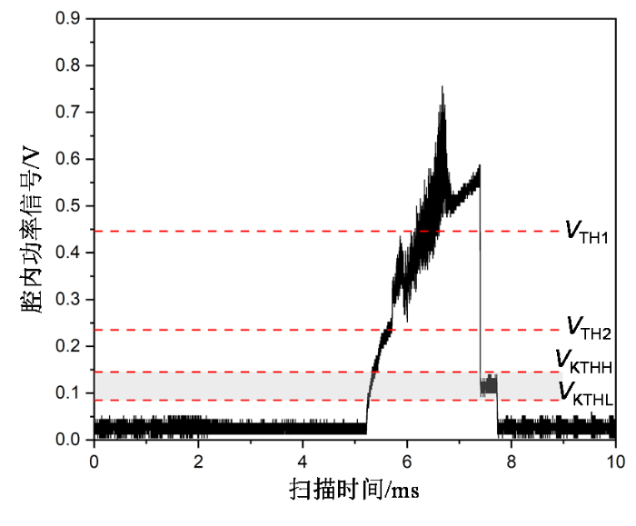 孤子搜索程序主要用于检索采样信号中单孤子态信号,当检测到单孤子信号后需要立即停止激光器频率扫描,并转为主动稳定控制状态.对孤子产生过程的信号分析可知,对于确定模式,其单孤子态对应的腔内功率信号幅度不受产生过程差异影响,即只要最终产生单孤子态,其信号幅度几乎一致,因此当系统采样分辨率足够时,可采用阈值检测方式判断是否产生Kerr光孤子,即根据连续扫描时优化得到的最优单孤子态的电平区间设定阈值检测范围VKTHL和VKTHH即可实现对Kerr光孤子的准确识别.而由Kerr光孤子产生的条件可知,激光器频率需要由蓝失谐扫描至红失谐,且需要经历MI态才可以产生Kerr光孤子,为避免蓝失谐侧腔内信号影响光孤子信号检测,在进行孤子信号检测前采用数字式迟滞比较器对蓝失谐侧信号进行处理,即按腔内功率信号的变化顺序增加两个阈值VTH1和VTH2并采用时间顺序检测方式使得两个阈值检测过程依次满足输入的腔内信号Vin ≥ VTH1和Vin ≤ VTH2.由于VTH2 < VTH1,故当迟滞比较器输出有效时,表明激光频移由蓝失谐处进入红失谐处,且该状态具有唯一性,随即可进行Kerr孤子信号检测.信号处理过程中各阈值设置示意图如图4所示.阈值检测可以判断腔内是否产生单孤子态,但无法判断其是否稳定,故进一步采用计数检测方式来判断孤子态是否达到稳定,即当输入信号Vin连续N个采样值均落入阈值检测区间时,可判定当前处于稳定的单孤子态.ADC采样周期为1 μs,检测点数N为设定值(通常为数十至100左右,通常设定为扫描时孤子台阶长度的1/4),当连续N个检测点后孤子信号仍然存在时则表明单孤子态至少维持数十μs至100 μs,可进行主动稳定,而在计数检测时间内单孤子态丢失则表明本次产生的Kerr光孤子适存时间较短,此时激光器继续维持扫描状态,并在下一周期重新检索孤子信号.