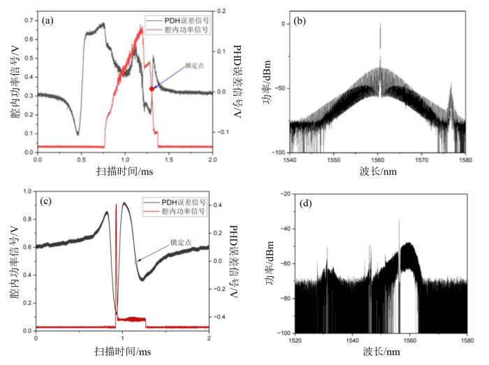 (a) MgF2微腔Kerr光孤子产生时腔内功率信号以及PDH误差信号;(b) MgF2微腔产生Kerr光孤子频率梳的光谱;(c) CaF2微腔Kerr光孤子产生时腔内功率信号以及PDH误差信号;(d) CaF2微腔产生Kerr光孤子频率梳的光谱