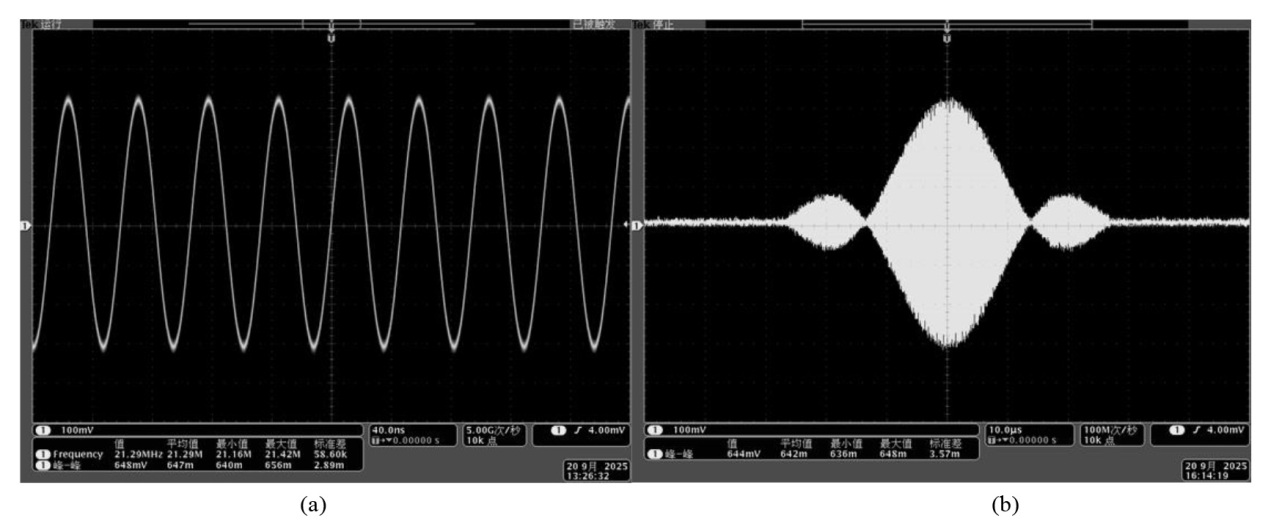 | 图7 (a)频率21.29 MHz、峰-峰值648 mV的射频脉冲信号;(b)中心频率21.29 MHz、峰-峰值648 mV的3-Sinc射频软脉冲包络 |
