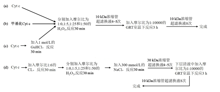 不同方式的样品氧化修饰处理流程图如图2所示. 其中,自然状态下Cyt c的氧化修饰实验流程如图2(a)所示:将纯化后冻干的蛋白用20 mmol/L的磷酸钠盐溶液(pH 7.0)溶解,稀释至终浓度为10 μmol/L,体积约为10 mL,蛋白与H2O2的摩尔比分别1 : 0、1 : 5、1 : 25 和1 : 50,加入H2O2后在室温下静置30 min待其充分反应,使用截留分子量为10 kDa的蛋白浓缩管超滤4~5次将体系中未反应完全的H2O2去掉. 再加入用20 mmol/L磷酸钠盐配置的终浓度为100 mmol/L的GRT试剂,保持体系终体积为10 mL,在室温下反应3 h,使蛋白充分进行羰基化标记,使用截留分子量为10 kDa的蛋白浓缩管超滤换液8次,以除去体系中残留的GRT试剂. 图2(b~c)分别为甲基化的Cyt c和部分去折叠状态下Cyt c的衍生化实验流程. 图2(d)为Cyt c与CL作用后的衍生化实验:将与CL互作后的样品经氧化处理后,加入体积约20 mL的含有0.3 mol/L磷酸钠盐缓冲液(pH 7.0)处理约30 min,充分破坏蛋白和CL的相互作用,用截留分子量为30 kDa的超滤管超滤多次去掉反应体系中未反应完全的H2O2,后续处理方法与其他样品一致.