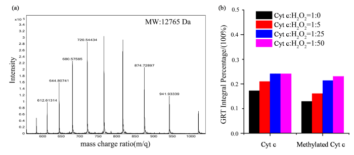 (a) Cyt c还原甲基化后的质谱图;(b)甲基化Cyt c被H2O2氧化修饰的程度对比图