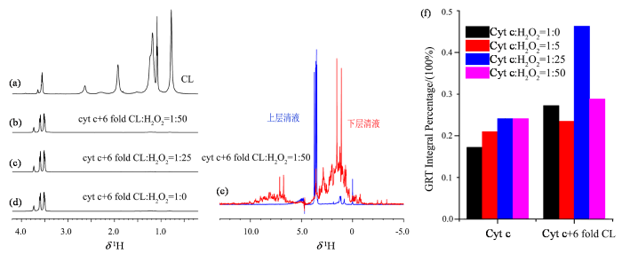 (a) CL的1H NMR谱图;(b-d) Cyt c与6倍摩尔比的CL相互作用后在不同H2O2浓度下的下层清液1H NMR谱图;(e)