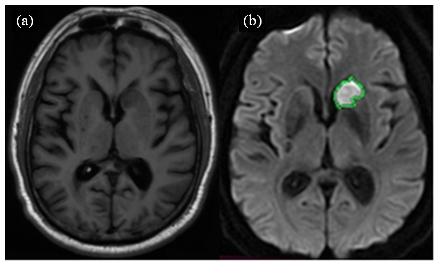 | Fig. 4 Magnetic resonance axial SE T1WI (a), DWI and the schematic diagram of the maximum lesion area measurement at the largest layer (b). In (a), MRI showed an acute infarction lesion in the head of the left caudate nucleus, presenting as long T1 signals; In (b), DWI showed restricted diffusion with high signal intensity. |